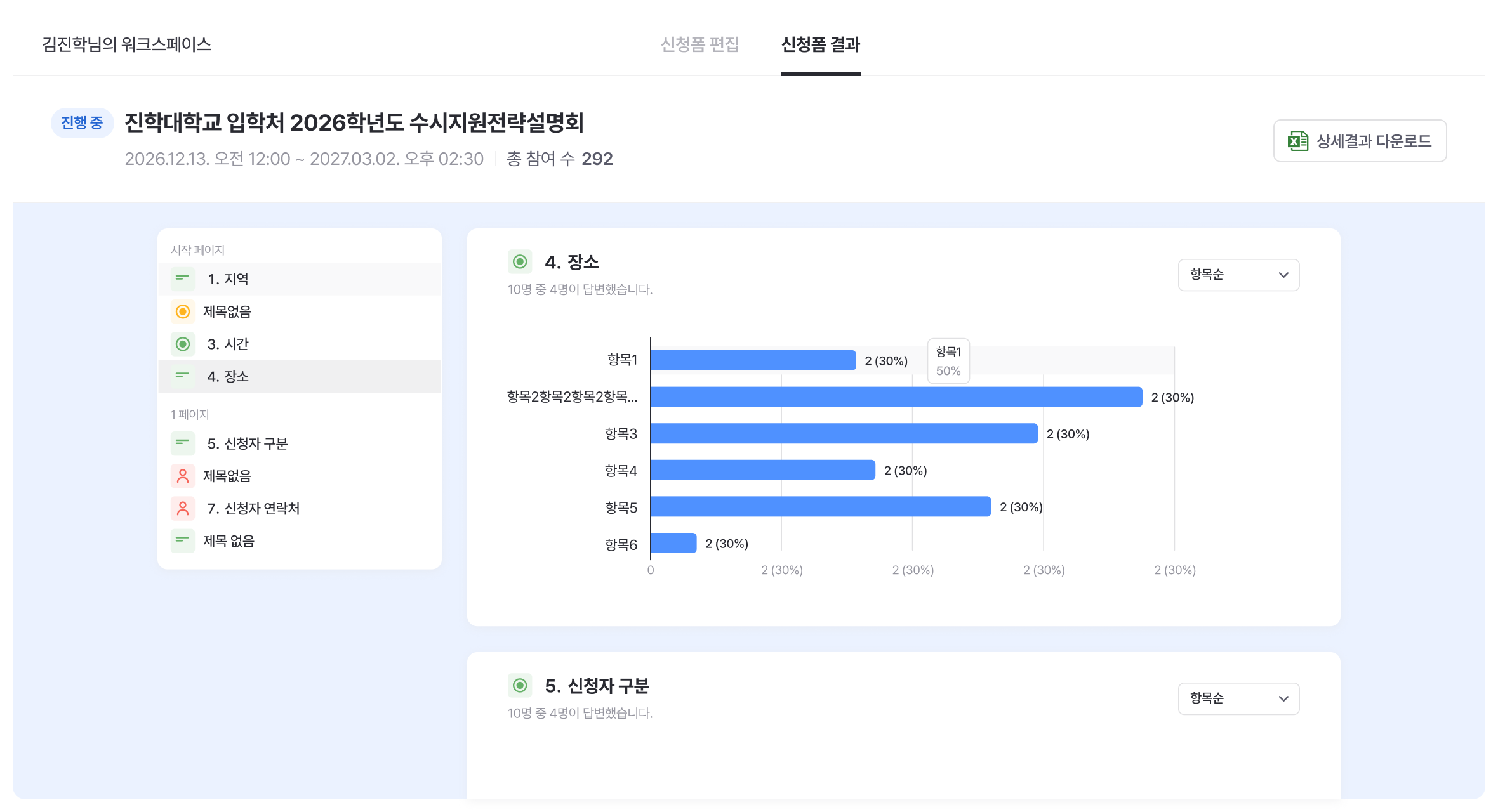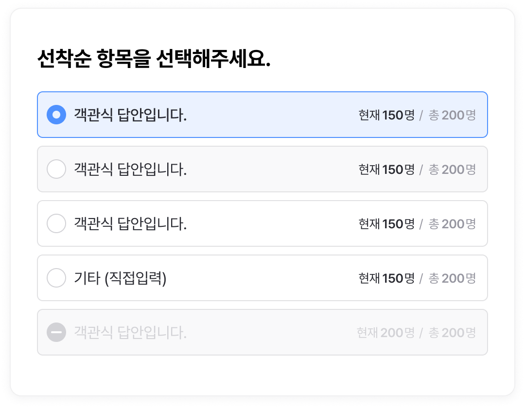 - 각 항목에 선착순 설정을 적용해, 제한된 인원만 응답할 수 있도록 제어할 수 있고