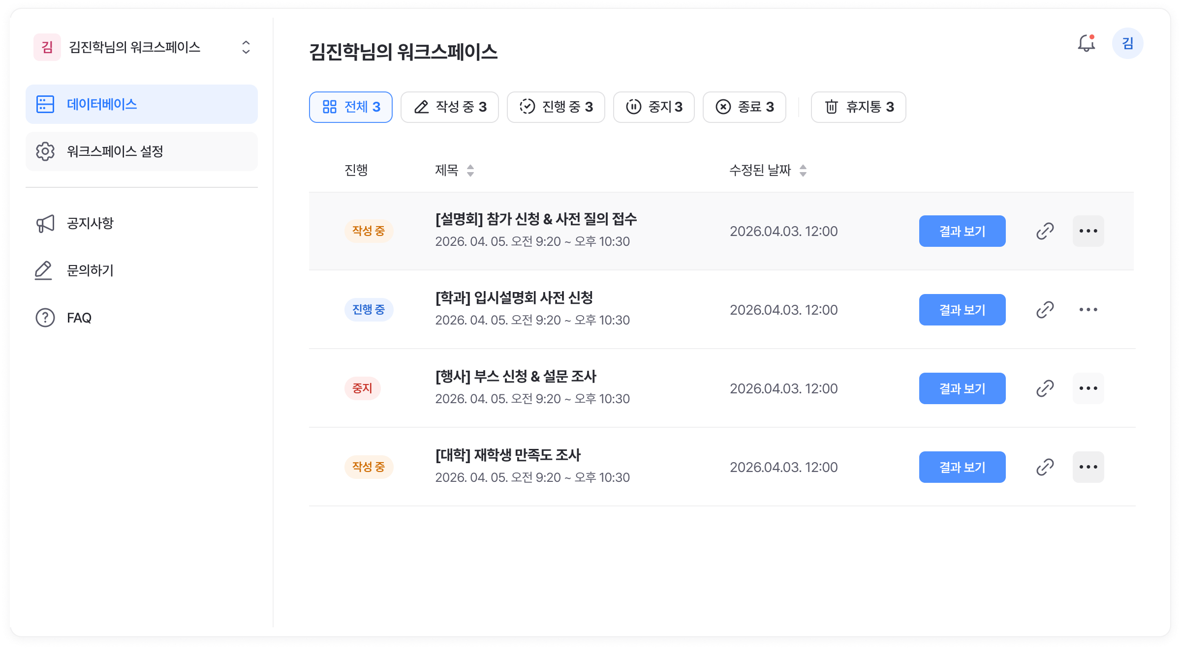 - 이 외에도 응답 결과 관리,응답 결과 관리,팀원 초대 및 협업, 만들 수 있습니다.